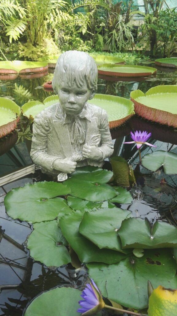 W Ogrodzie Botanicznym znajduje się też rzeźba przedstawiająca Nemeczka w stawie, gdzie chłopiec ukrył się w wodzie przed czerwonymi koszulami. Pochodzi ona z 2019 roku. Pewnie pamiętacie tę scenę? Była to druga kąpiel Nemeczka tego dnia, po jego pechowym wpadnięciu do wody podczas wsiadania do łódki.