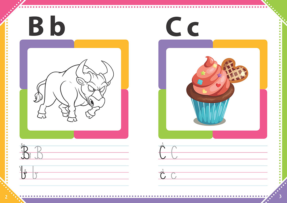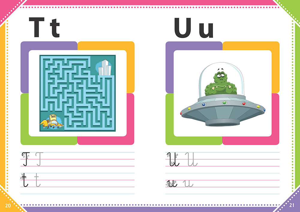 Przy każdej literce zamieszczono wyraźny wzór wraz ze strzałkami pokazującymi, jak napisać ją prawidłowo. Niektórym literkom towarzyszą barwne rysunki przedstawiające zwierzę, osobę lub rzecz na daną literkę, przy innych rysunek zamieniono na kolorowankę lub ciekawy labirynt.